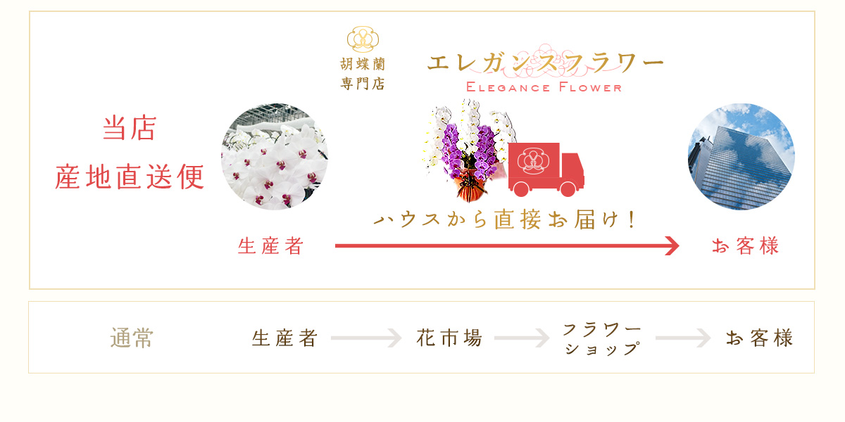 当店では、新鮮な胡蝶蘭をお届けするために生産農家から直接御送りします。