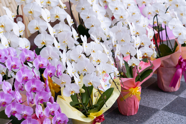 本来、開業、開院、開店などで御祝の気持ちを伝えるギフトである以外に、華やかに門出の演出をしたり、贈り先様のお客様や、道行く新規顧客様へのお知らせになるのが胡蝶蘭や、花です。
